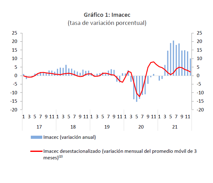 De acuerdo con la información preliminar, el Imacec(1) de diciembre de 2021 creció 10,1% en