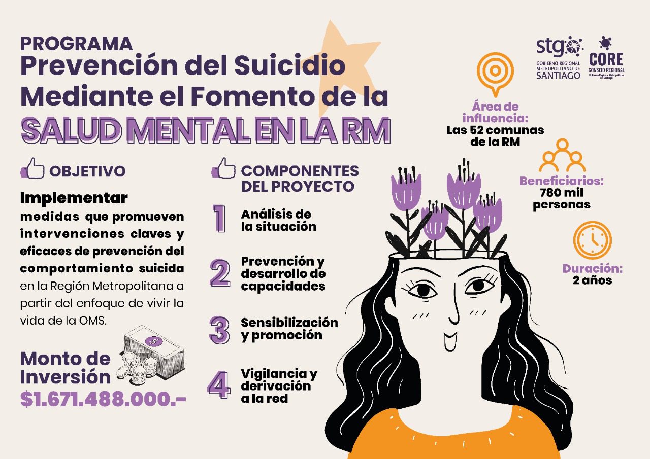 “El objetivo de este programa es salvar vidas”, afirmó el Gobernador de la Región Metropolitana, Claudio Orrego, al presentar el ‘Programa Regional de Prevención del Suicidio’, el más importante de Latinoamérica y de la historia de la ciudad de Santiago. El proyecto busca mediante el fomento de la salud mental y otras actividades integrales, enfrentar un tema complejo como es el aumento de suicidios, depresión, ansiedad, acoso escolar y otros trastornos anímicos presentes en la población.